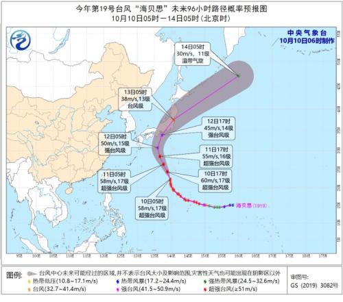今年第19号台风“海贝思”继续保持着超强台风的强度,预计,“海贝思”将以每小时20公里左右的速度向北偏西转东北方向移动,逐渐趋向日本东南部一带沿海,并有可能于12日夜间登陆或擦过上述沿海;11日之前,“海贝思”强度变化不大,尔后将逐渐减弱。