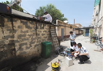 8月1日,在房山生态环境夏季执法检查行动上,良官路某餐馆后厨,房山生态环境局检测人员在进行油烟抽查。新京报记者 李木易 摄