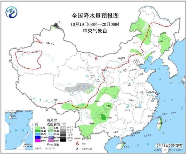 10月18日08时至19日08时,新疆北部、内蒙古中部、东北地区中东部、四川盆地西部、云南、西藏、青海西南部等地的部分地区有小到中雨或雨夹雪,其中云南中南部有分散性大雨,新疆阿勒泰、伊犁河谷和沿天山一带等高海拔地区有中到大雪,局地暴雪。新疆北部和东部、内蒙古西部的部分地区有4~6级,阵风7级的大风,山口地区风力可达8~10级。