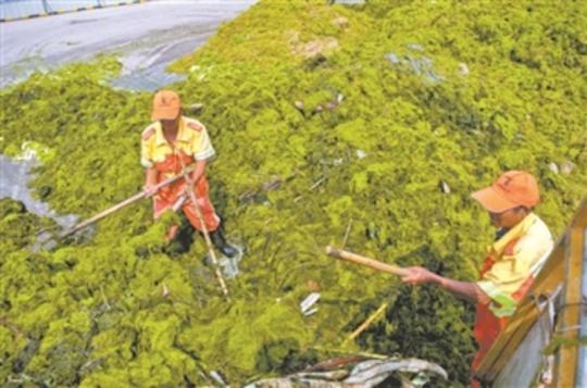 山东青岛,清理浒苔的环卫工。本报记者 王伟伟 摄