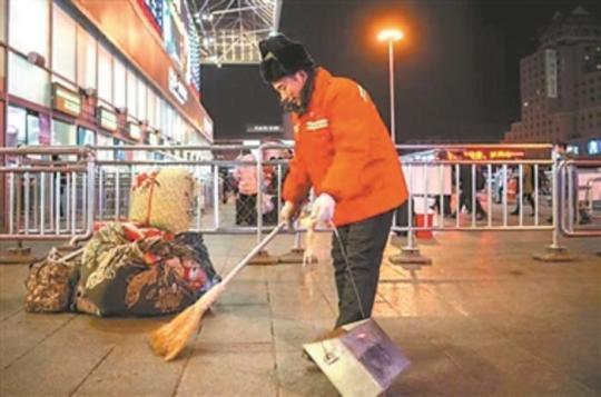 春节期间坚守在北京西站工作岗位上的环卫工。 本报记者 王伟伟 摄
