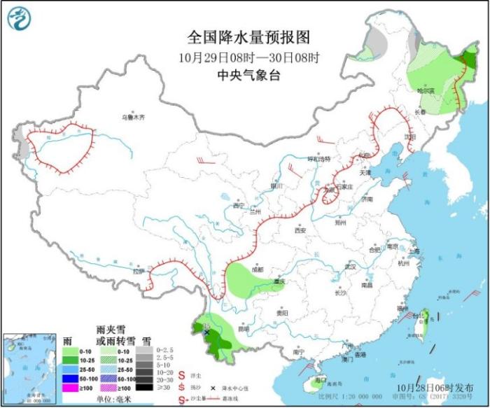 预计28日至29日,淮河以北大部地区有4~6级风,阵风7~9级,局地阵风可达10级,内蒙古中西部、宁夏、陕西北部及华北等地部分地区伴有沙尘天气;上述大部地区气温下降4~6℃,局地降温8~10℃;内蒙古中东部、东北地区有小到中雨(雪)或雨夹雪天气,局地大雪。公众出行需做好防风措施;风大物燥,注意用火安全。