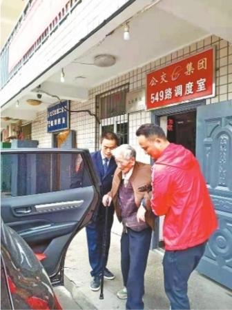 公交549路线长刘飞和司机陈文强搀扶陈大爷坐上刘飞的私家车,准备把他送回家通讯员肖华 摄