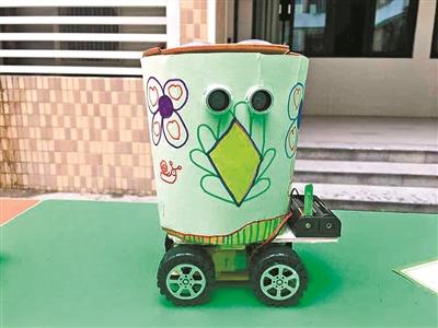 在倡导垃圾分类的今天,一年级3班的学生周芯羽在妈妈的帮助下,制作了一辆“跑跑垃圾车”。“它是一辆会跑会自动开门的垃圾车,我在它的眼睛上安装了感应器,当你把手靠近它的眼睛时,感应器就会发射超声波感应到有人要扔垃圾,门就会自动打开。为了方便扔垃圾,我在垃圾桶下面装了轮子,把电源打开,垃圾车就会开动。”周芯羽一边介绍,一边向同学们展示。