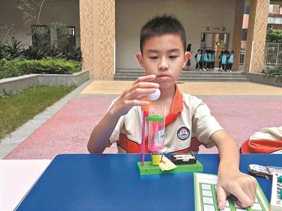 三年级的梁博皓展示作品“乒乓球升降机”。