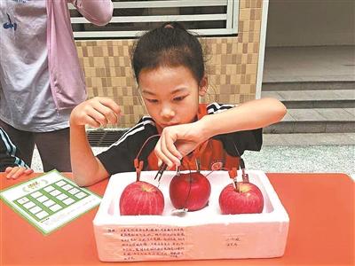 这些作品大多是取材于生活,二年级3班的学生罗芷浠的“水果电池”展位聚集了一大群围观的学生。这可不是闹着玩,也不是吃的,是发电的。这个“水果电池”由锌片、铜片、导线、三个苹果、时钟组成,原理是水果中的果酸可作为电解质形成一个原电池。当铜片和锌片通过电解质和导线构成闭合回路,铜片产生正电荷,锌片产生负电荷,因此闭合回路中产生电流,若在该电路中再连接一个时钟,时钟便可通电运作了。