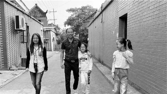 幸福的一家四口。(左起:大姐宝宝、爸爸、小妹宝庆、二妹宝珠。)