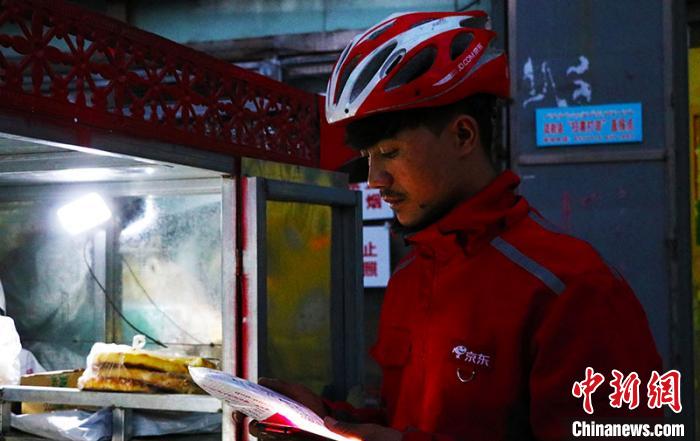 夜幕降临时,艾尼瓦尔·艾合买提快递包裹还没有送完,他在整理好货箱,将继续踏上送货的路上。“平时自带干粮,饿得时候吃一点。吃中午饭的时间省下来,为了更快送完货。”