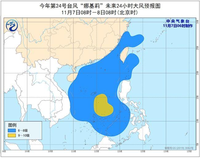 受冷空气和“娜基莉”的共同影响,7日08时至8日08时,南海大部海域、台湾海峡、巴士海峡、东海南部海域、台湾以东洋面、浙江南部沿海、福建沿海、台湾岛西部沿海、西沙群岛、中沙群岛和南沙群岛将有6-8级大风,其中南海中南部的部分海域有9-10级大风,阵风11-12级。