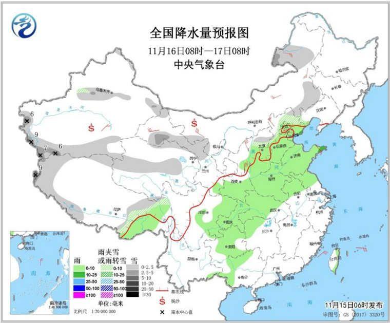 明天,雨雪范围开始发展增多,预计,11月16日08时至17日08时,新疆沿天山地区、内蒙古西南部和东部、青藏高原北部和西部、甘肃河西、山西北部、河北北部等地的部分地区有小到中雪或雨夹雪,其中,新疆南疆西部山区、西藏西部等地的部分地区有大雪(5~9毫米)。西北地区东部、华北中南部、黄淮、江淮大部、江汉大部、西南地区东部等地的部分地区有小到中雨。内蒙古、甘肃河西等地的部分地区有4~6级及以上风。巴士海峡部分海域风力可达8级、阵风9级。