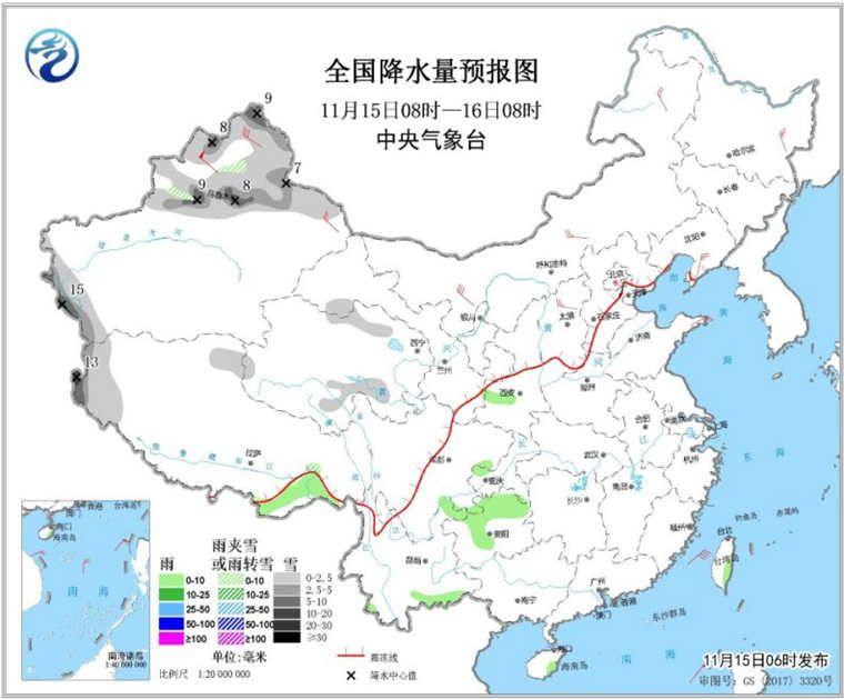 预计今天,我国依旧雨雪,,预计11月15日08时至16日08时,新疆北部和南疆西部、西藏西部、青海北部和南部等地的部分地区有小到中雪,局地大雪或暴雪(10~15毫米)。西藏东南部、贵州中北部、云南南部等地的部分地区有小雨或阵雨。新疆北部、内蒙古中西部和东北部等地的部分地区有4~6级风,其中,新疆北疆西北部部分地区风力可达7~8级。
