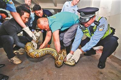 在接到市民报警后,佛山市公安局禅城分局社区民警到场与群众合力将蟒蛇抓获。昨日,蟒蛇已经移交给佛山市野生动物保护,安置。据该,饲养员介绍,这条蟒蛇无毒,疑似为国家一级保护动物。