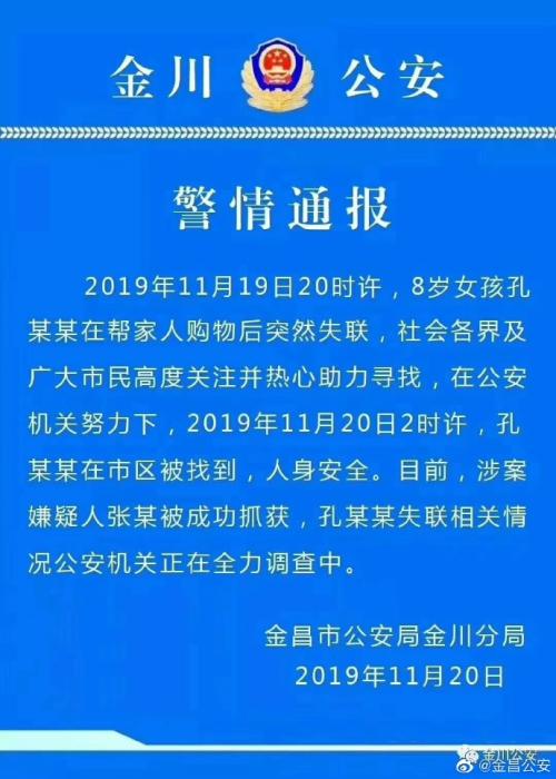 中新网11月20日电 据甘肃省金昌市公安金川分局微博消息,11月19日20时许,8岁女孩孔某某在帮家人购物后突然失联,社会各界及广大市民高度关注并热心助力寻找,在公安机关努力下,11月20日2时许,孔某某在市区被找到,人身安全。