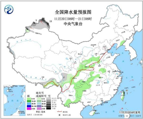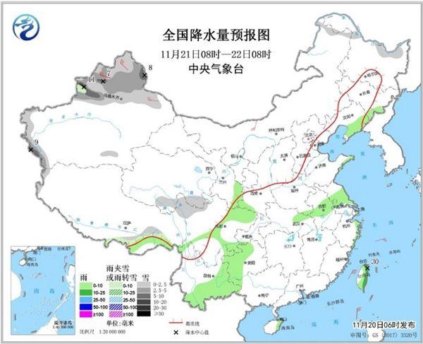 111月21日08时至22日08时,新疆北部及南疆西部山区、青海南部等地部分地区有小到中雪或雨夹雪,其中,新疆阿勒泰及伊犁河谷等地部分地区有大到暴雪(5~11毫米)。东北地区东南部、西北地区东南部、江淮大部、川西高原南部、西南地区东部、台湾岛等地部分地区有小到中雨,
