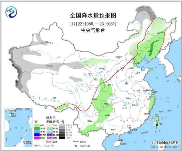 11月22日08时至23日08时,新疆伊犁河谷及南疆盆地、内蒙古东部和西部、黑龙江中部、甘肃河西地区等地部分地区有小到中雪或雨夹雪,其中,南疆西部山区、西藏西部等地部分地区有大雪(5~9毫米)。东北地区中南部、西北地区东南部、华北地区东北部、西南地区东部、云南南部、台湾岛等地部分地区有小到中雨,其中,台湾岛东南部局地有大雨(25~30毫米)。