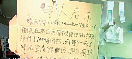 这家店的老板名叫许国兵,重庆人,4年前来到长治经营这家面条店。11月1日12时左右,一名顾客在许国兵的面条店买面条后用微信支付,原本应付1.5元,结果付了150元,足足100倍。因为对方是扫码付款,许国兵的手机里只能查到一个转账的凭证,没法和对方联系退款。无奈之下,他想到一个笨办法,写了一张寻人启事,挂在店里,希望能找到这位顾客,退还多收的钱。