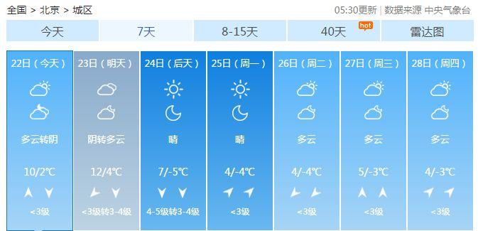 中国天气网讯 今天(22日)是小雪节气第,,预计今天白天北京多云,,气温较前一日有所回升,在10℃左右,但是能见度较差。此外,周末北京将再迎冷空气降温,市民需提前做好出行安排,注意防风保暖。