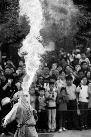 只见孙怀生端着一个油碗绕场走一圈,他把碗伸到游客面前让他们闻一闻。从游客的表情上看,确实有股刺鼻的味道。孙怀生喝了一口,做一个吞咽动作,然后再说几句话,证明自己已经把煤油喝进肚里了。他舞动着小火把,然后扎稳马步,吼一声,只听见“噗——”的一声,一条火龙喷出,火焰还伴随着浓浓的黑烟。记者了解到,他经常表演的地方旁边老槐树枝叶都被熏黑了。除了表演喷火,孙师傅还会玩一些花样,比如把火吞在嘴里,游客把香烟伸进他的嘴里点烟;他还会表演喷火烤羊肉串。