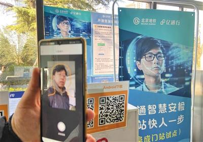 昨日上午,记者在地铁2号线阜成门站C口处看到,安检区域前增加了两个安检门,上方有带显示屏的监控探头,能识别乘客面部信息。站外放置了宣传海报,印有人脸识别安检专用APP下载二维码。早高峰,乘客大多步履匆匆,很少有人停下来仔细阅读。