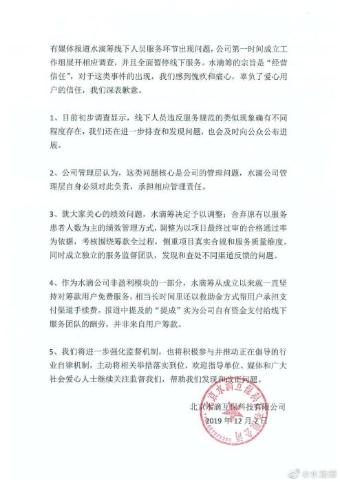 中新网客户端12月2日电(谢艺观)针对媒体报道的“水滴筹员工医院扫楼筹款”事件,水滴筹2日晚间再发声明称,①初步调查显示,线下人员违反服务规范的类似现象确有不同程度存在,还在进一步排查和发现问题。②舍弃原有以服务患者人数为主的绩效管理方式,调整为以项目最终过审的合格通过率为依据。③报道中提及的“提成”实为公司自有资金支付给线下服务团队的酬劳,并非来自用户筹款。