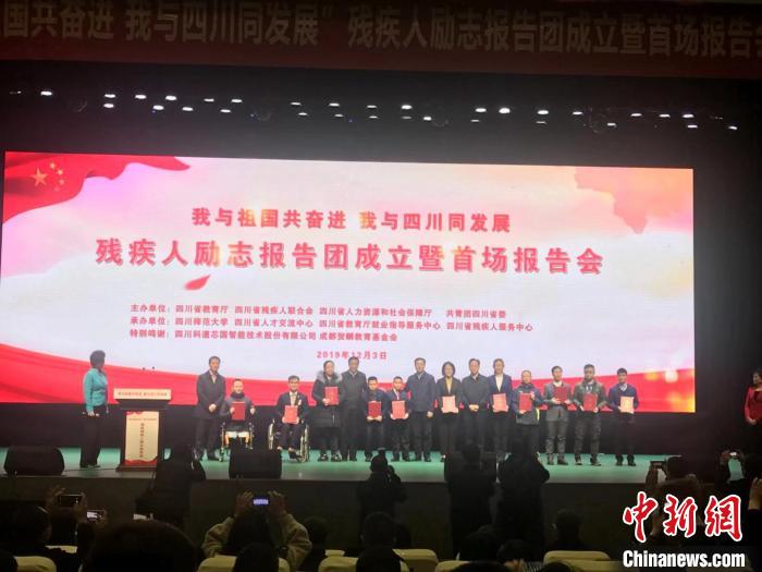 中新网成都12月3日电 (岳依桐)正值一年一度的国际残疾人日,3日,四川成立残疾人励志报告团。首批报告团团员共23人,包括在机关、企事业单位等机构就业的自强残疾人代表、在校自强残疾大学生代表、农村自强残疾人代表、创新创业自强残疾人代表、残疾运动健将代表等。