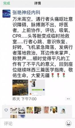 张艳和护士对视一眼,“不好,脉搏消失,立即急救!”危机时刻,有着多年急救经验的张艳没有慌乱,迅速给大家安排好了任务:病人放平、开始心肺复苏、护士紧摸脉搏、空乘将抢救药抽进了针管里……