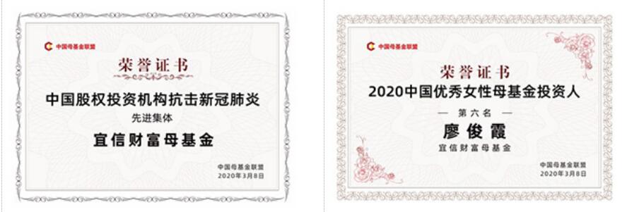 3月8日,由中国风投委、中国的母基金联盟主办的“2020中国股权投资行业开年大会”上,中国的母基金联盟隆重表彰在疫情期间作出突出贡献的优秀机构、集体和个人,宜人金科母公司宜信旗下宜信私募股权母基金荣获“中国股权投资机构抗击新冠肺炎先进集体”,宜人金科母公司宜信旗下宜信私募股权母基金管理合伙人廖俊霞荣获“2020中国优秀女性母基金投资人第六名”。(详见2020年第05期《宜信快讯》)