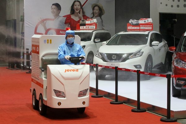 2020年6月19日,在山东烟台国际博览,,工作人员驾驶杰瑞华创静电喷雾消毒车对车展现场进行消毒