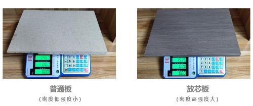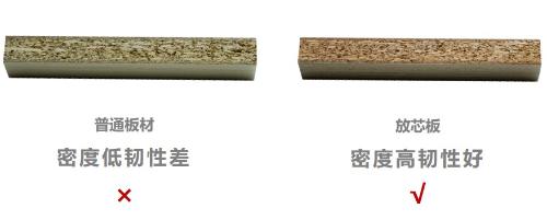 普通板材以3-5年的速生林/稻草/芦苇等为基材,材质松软、强度低,甚至出现腐烂的现象;放芯板,以东南亚进口25年以上的优质成材橡胶木为基材,稳定性好,韧性好,密度更高,可以生产出更高质量的家具产品。