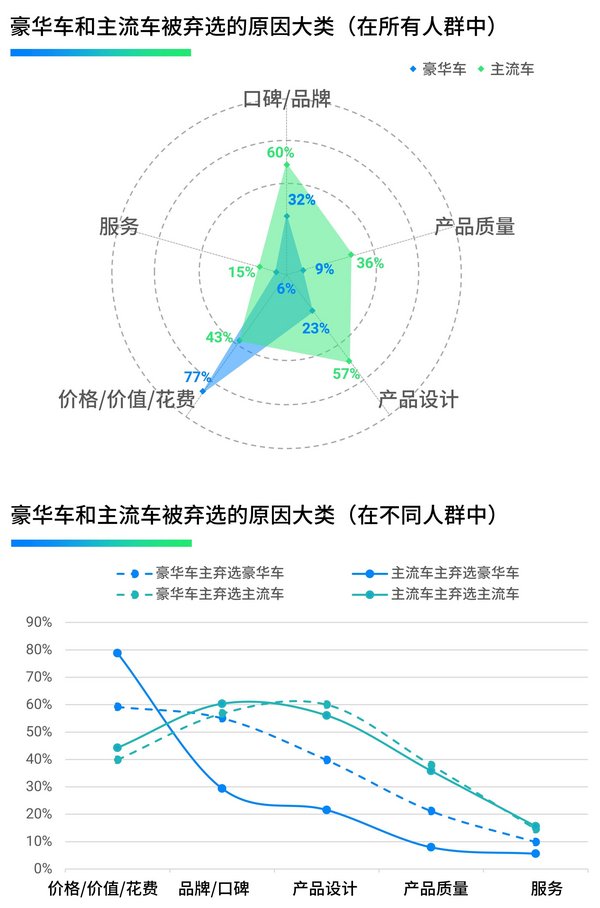 研究发现,豪华车与主流车被弃选的主要原因具有明显差异。对于豪华车品牌而言,近八成(76.9%)弃选原因与价格和后续花费有关。而对于主流车品牌来说,品牌/口碑(59.5%)和产品设计(56.9%)是消费者将其从考虑范围中剔除的最主要原因。