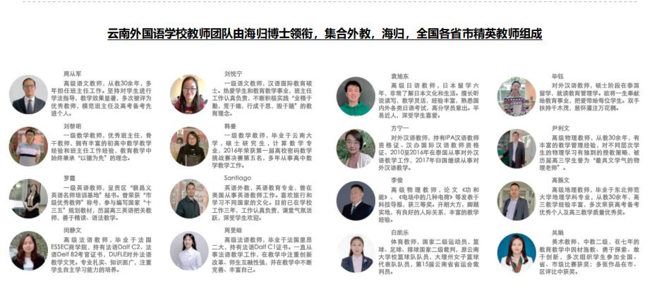 云南外国语学校师资团队由海归博士领衔,集合外教,海归,全国各省市精英教师组成,同时也是上海市浦东新区裴昌义英语教师培训基地云南,。除了普通初、高中课程,学校还开设全省,的初中英法、英日双外语课程,以及高中学历制法语、日语班,也是A-Level国际课程考试,。