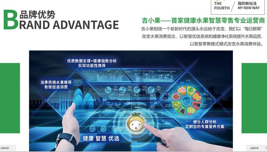 吉小果线下智慧体验店+线上智能购物平台+智能健康导购系统+水果健康净化洗系统+阿里店铺智慧管理系统五大部分组成,以全产业链生态,开启健康鲜果智慧零售新时代!
