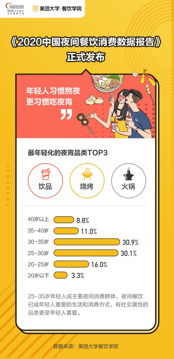 7月9日,雀巢专业餐饮联合美团大学餐饮学院、餐饮老板内参,发布《2020餐饮夜间消费与夜宵品类发展报告》,基于美团点评大数据,就2019年夜间餐饮市场概况、夜间消费,品类做出全面分析总结,帮助餐饮从业者洞察新机遇,助力餐饮市场复苏。