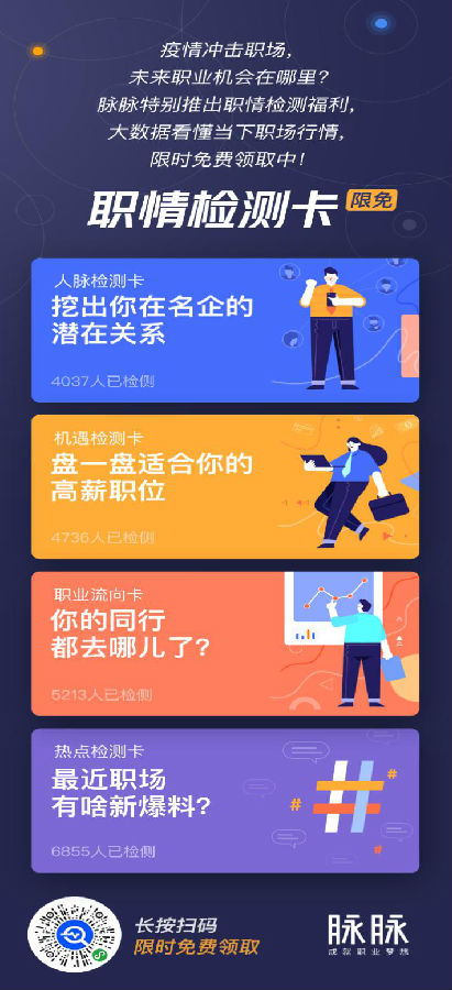 这也解释了缘何近期上线的“职情检测卡”小程序在职场人群中备受关注。“你在名企有哪些潜在人脉?你的同行都去哪些公司了?近期你关注的领域中有哪些高薪职位?职场中有哪些热门事件?”——日前,职场社交平台脉脉上线了名为“职情检测卡”小程序,共分为四张“卡片”,分别从人脉、机遇、职业流向和职场热点四个维度,为职场人勾勒出自己的职场人脉与发展图谱。