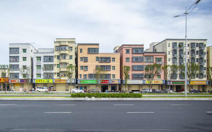 如今行驶在公常路上,一排活力四射的建筑尤为亮眼。以前,公常路四周围绕着低矮的居民楼、商铺,部分外墙出现瓷片脱落现象,不仅影响美观,还缺少活力。此次沿线建筑立面提升改造约235栋,改造立面面积约30万平方米,目前已全面完工。商铺建筑立面改造结合了政府的发展定位, 利用铝板、软瓷等材料,奉行跳色理念,充分把握人性化、整体性、文化性的原则。