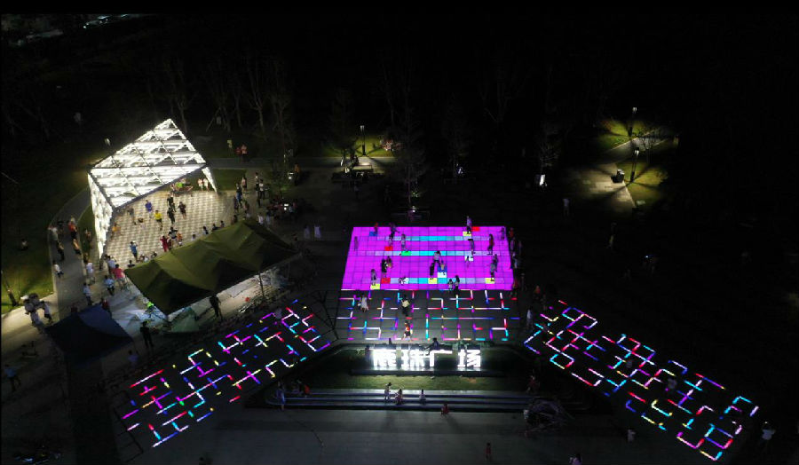 站在公常路圳美村口便可看到遒劲醒目的“鹿珠广场”的,坊。从牌坊进入广场,可以看到由216个格子组成的格子路面,踩上去立即发光发亮。夜晚灯光散射四周,营造出光怪陆离的都市景象。广场周围由各色花卉绿植组成的“小花园”和碧蓝的走道,有不少游客在此谈天、纳凉。