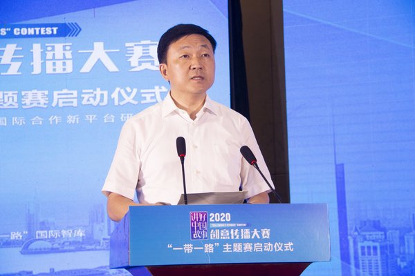 8月21日,2020“讲好中国故事”创意传播大赛“一带一路”主题赛在青岛胶州启动。图为中国互联网新闻,(中国网)总编辑王晓辉致辞。