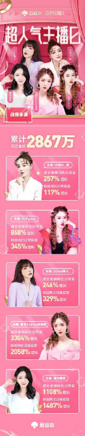 在8月的“超人气主播日”活动中,除新人主播外,此次还有三位“老将”的身影。主播小甜心_呢作为平台头部主播,仍然实现了自我突破,成交金额同比日常增长257%;主播叶子yzzz的粉丝同比增长也达到了345%;主播yoke瑜儿_也实现了成交额、粉丝双料超三位数增长。此外,主播敏恩Korea在韩国、主播潘仲晴呀两位中腰部主播,同比日常均实现了超过四位数的增长。蘑菇街的“超人气主播日”活动,已逐渐成为主播成长的超强催化剂。