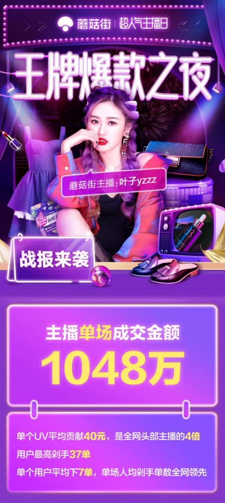 蘑菇街主播叶子yzzz除了参与“超人气主播日”活动外,蘑菇街平台还为其量身打造了“网罗全网爆款,主播零佣回馈”的爆款之夜活动,助力主播叶子yzzz创下单场成交金额1048万的好成绩。