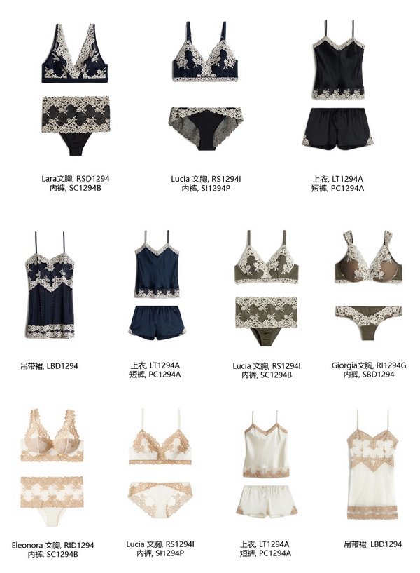 Intimissimi优雅花卉系列款式多样。Giorgia半罩杯文胸,配有衬垫与钢圈,缀以双色花卉蕾丝,展现曼妙身姿。Eleonora软钢圈文胸,塑形半杯设计,打造魅力胸型。Lara双色蕾丝三角文胸,无钢圈设计柔软舒适,享受全天候无拘无束。Lucia无钢圈三角文胸,结合轻薄衬垫,自然呈现美好胸型。文胸可与同系列短裤和吊带裙搭配,轻松打造多样化优雅造型。