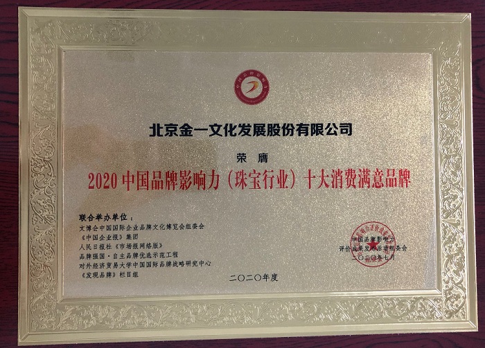 对黄金珠宝产品高品质的坚守是金一文化赢得消费者信赖的基础,也是自身企业不断被市场认可的根本,在多年的前进道路上,金一文化一路披荆斩棘,不仅收获广大消费者的喜爱,也获得诸多荣誉称号。2020年,在第七届中国品牌影响力评价成果发布活动中,金一文化凭借自身实力荣获“2020中国年度影响力品牌”、“2020中国品牌影响力(珠宝行业)十大消费满意品牌”两项殊荣,为金一文化的前行之路再添辉煌一笔,这不仅是对金一文化行业地位的认可,更彰显着金一文化在十余年发展过程中所积累的深厚消费者基础和品牌实力。