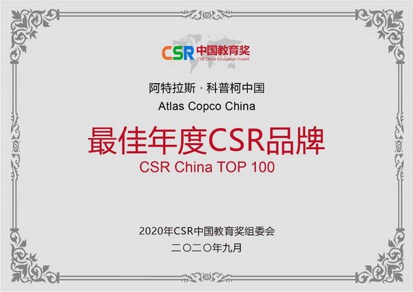 2020年9月9日,第四届“CSR中国教育奖”年度成果及获奖名单线上发布,阿特拉斯·科普柯中国凭借在履行企业社会责任助力学生走进企业方面的优秀表现,荣获“2020年CSR中国教育奖 - 最佳年度CSR品牌”。