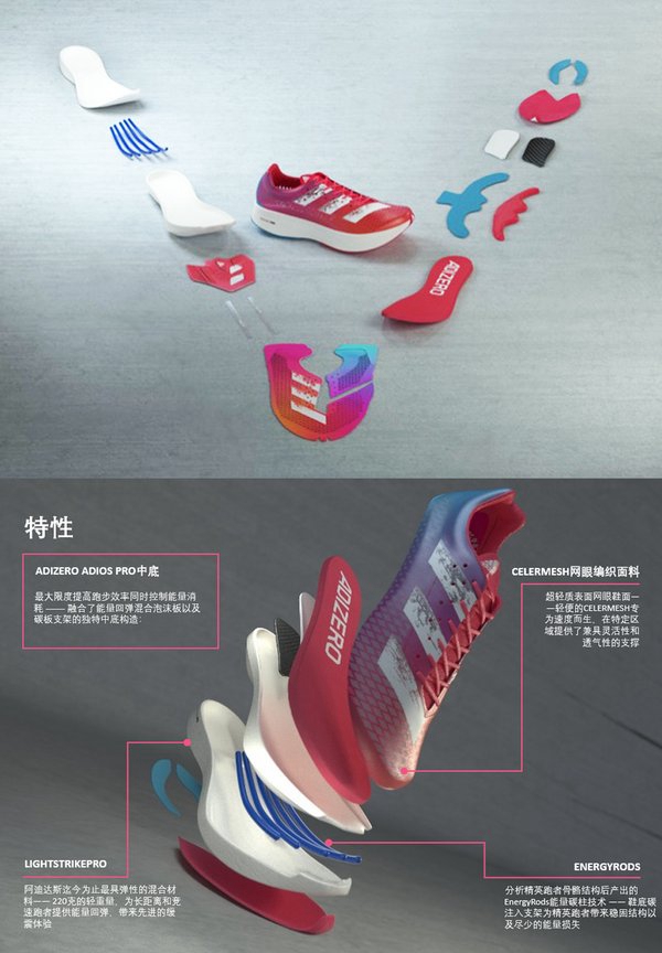 adizero adios Pro搭载了许多,创新技术,包括EnergyRods能量碳柱支撑技术,可助力运动员跑得更快。阿迪达斯设计师根据生物力学实验和解剖实验结果,不断完善原型设计,最终打造出了一种符合精英运动员跖骨特征的跑鞋结构。