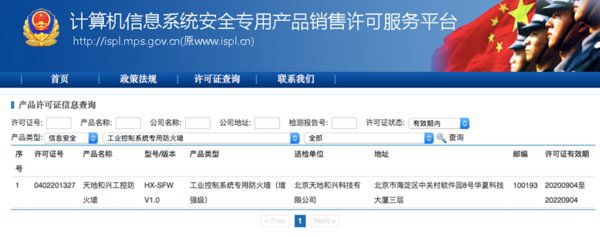 从美通社获知,近日,天地和兴旗下“地盾”系列工控防火墙顺利通过公安部计算机信息系统安全产品质量检测,测试,取得工业控制系统专用防火墙(增强级)销售许可证(以下简称销售许可证)。天地和兴作为国内工业网络安全,者,凭借其在工业网络安全领域深耕数十年的服务经验,不断精雕细琢各类工业网络安全产品,以求给用户提供更好的使用体验。工控防火墙作为天地和兴旗下防护类主打产品,拥有国内,的工控协议深度内容检测技术。天地和兴能够在国内第一个取得工业控制系统专用防火墙(增强级)销售许可证,不仅仅代表国家相关部门对天地和兴安全产品的认可,更是天地和兴综合实力的体现。