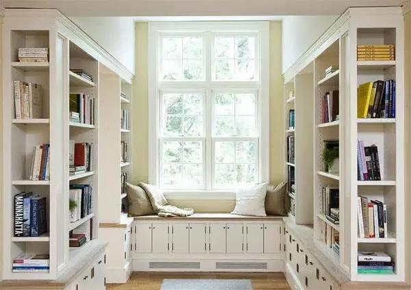 空间有限,飘窗可不能浪费,书柜与飘窗的组合是一个理想选择。将飘窗四周全部利用,打造收纳柜,不仅将多余空间有效利用也增加了物品收纳容量,完全能满足你的书籍收纳需求,就算没有大书房也能创造一个舒适的阅读区。