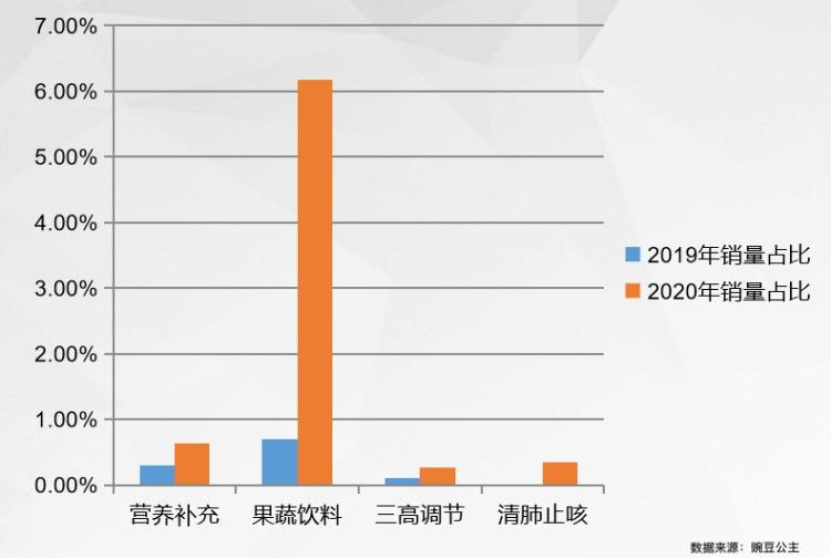 诸如,健康类果蔬饮料销量占比同比增加8.8倍,清肺止咳类商品销量占比同比增长3.5倍,营养补充类商品销量占比同比增加2.5倍,茶饮料销量占比同比增加2.3倍,三高调节类商品销量占比同比增加2.6倍。