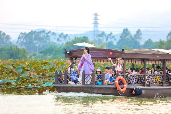 除了琳琅满目的都市休闲娱乐体验,黄金周期间,华侨城也为广大游客提供了不少拥抱自然美景的周边游新去处。10月1日,华侨城古劳水乡度假区一期正式开门迎客,伴随着渔夫的号子和岸上的击鼓声,满载游客的船只陆续出发,“一帘幽梦”、“水上集市”等水上小品以行进式的形式呈现在游客眼前,为广大游客展现了好山好水的自然之美和魅力水乡的生活情韵。
