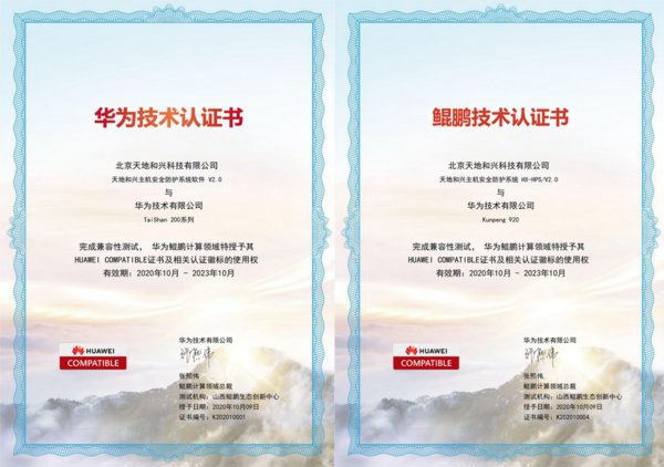近日,天地和兴主机安全防护系统软件与华为技术有限公司TaiShan200系列、Kunpeng920芯片完成双料兼容认证,获得华为鲲鹏计算领域授予的HUAWEI COMPATIBLE证书及认证徽标,为工业网络安全领域信创产业生态新添擎天柱石。