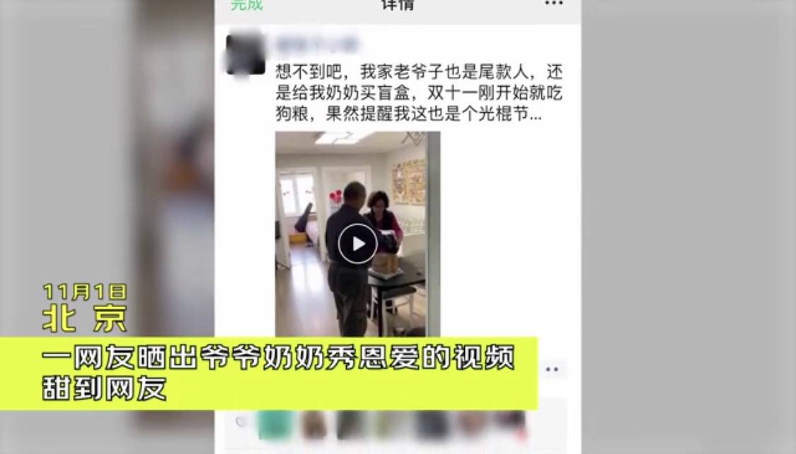 视频里,一位奶奶手握一套盲盒,小心翼翼又欣喜若狂。这一幕来自来源于11月1日网友分享的一段视频,“想不到吧,我家老爷子也是尾款人,还是给我奶奶买盲盒,双十一刚开始就吃狗粮,果然提醒我这也是个光棍节…”