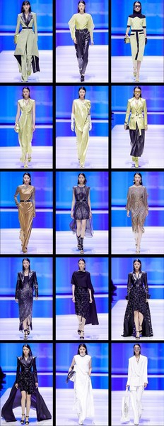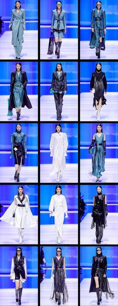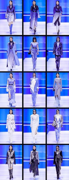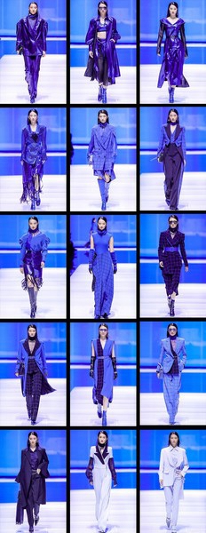 模特身着一套,冲击感的定制蓝色廓形外套以笃定的姿态拉开了大秀序幕。该系列运用提花及植绒等工艺再造材质,结合时下科技感十足的“蓝片”科技面料,融入高定手法和真人立体剪裁,使得廓形外套、风衣、阔腿裤简约又干练,细节中又透露出未来感,彰显自信独立的精英女性形象。